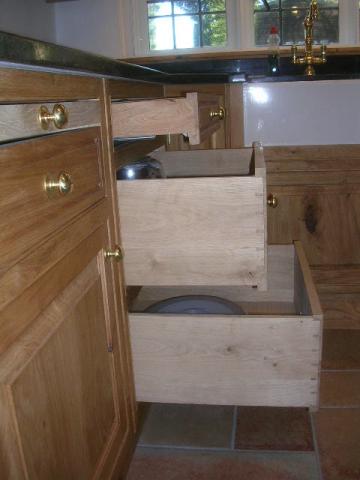 This kitchen I built from scratch for the client. All apart from the dishwasher and fridge units are a non standard size for maximum storage area. Units made using 19mm double side light oak finish with a 25mm solid oak facing and beading. Doors made from oak with a raised edge, stile and rail in ogee profile. Draws made from oak with traditional (slender) dovetails. Ogee moulding on draw fronts to match doors.