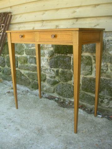 Made in quarter sawn oak. Ebony stringing on the tapered legs and to the edges of the top.